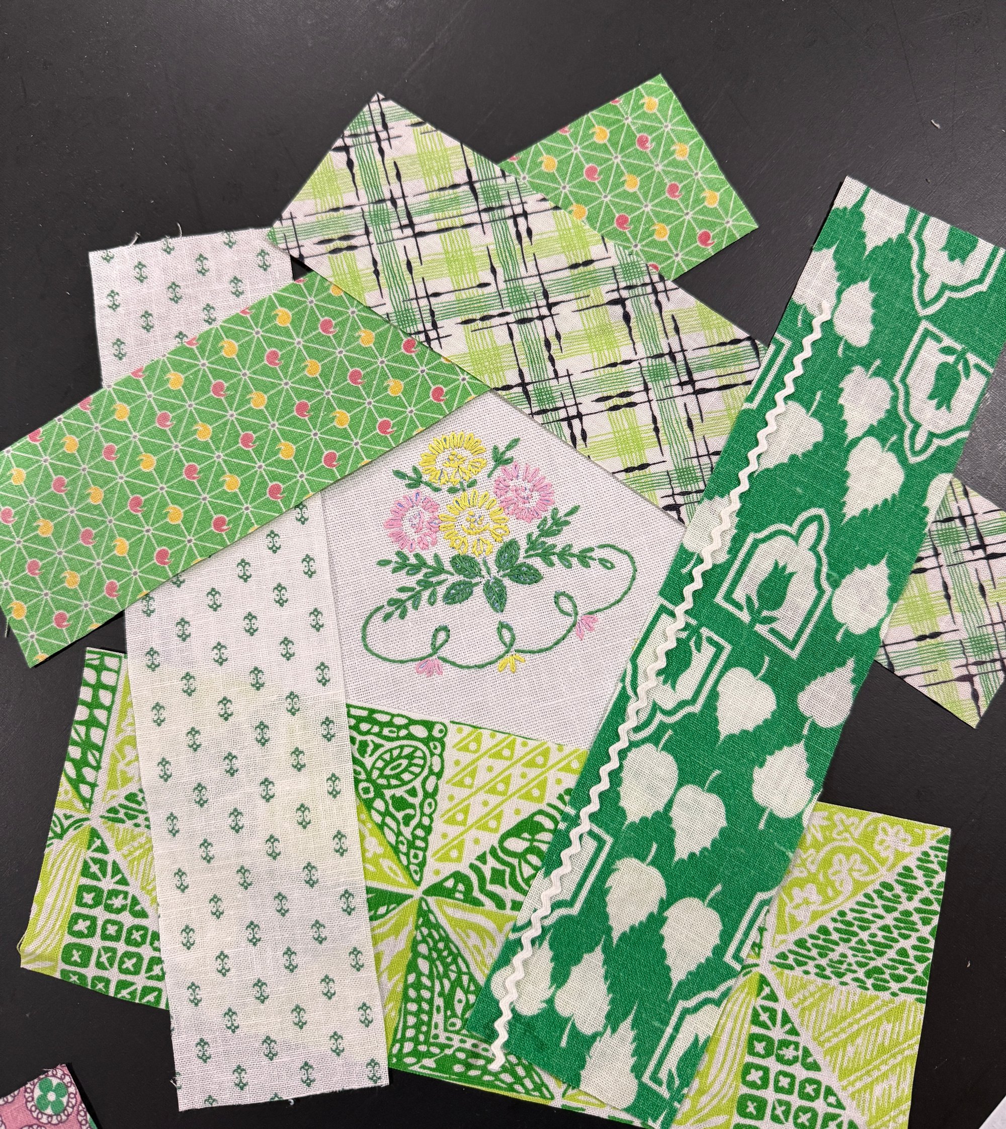 One pincushion kit includes 1 vintage embroidery, 5 feedsack strips, 1 square of vintage feedsack fabric for backing, rick rack, beads, a Glide 60wt thread bobbin and 2 different needles. Hobbs fusible (iron on) batting for one front and back as well. You’ll need crushed walnut shells to fill. (find in your local pet food shop as lizard litter or on Amazon) US shipping is $4.75, plus tax added where applicable